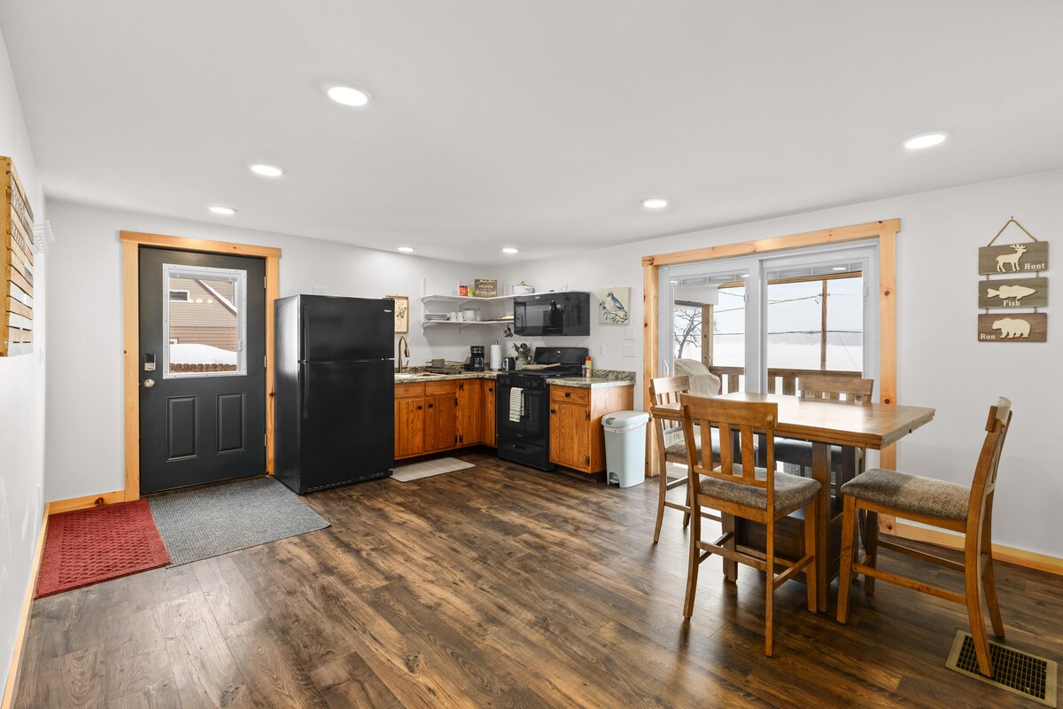 Soak in the Adirondacks from this rustic, newly remodeled one-bed apartment with a king size bed, full kitchen and bathroom. Start your day with a beautiful view of the sunrise over the Moose River. Feel free to launch one of our kayaks from our private dock, watch the stars from the hot tub or by the fire pit, take a bike ride on our bikes or just watch the amazing wild life and sunset from your private deck. Close to restaurants, shopping, hiking, and all of the summertime fun in Old Forge.