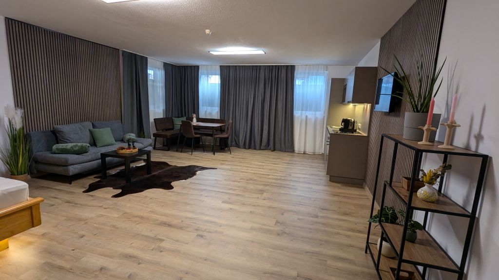 El pequeño y acogedor departamento "WINTER" está ubicado en el sótano, ¡pero no te preocupes! ¡Las enormes ventanas panorámicas proporcionan mucha luz y tienes acceso directo a un patio grande y luminoso! El apartamento es ideal para una persona, pero dos personas también pueden alojarse en el cómodo sofá cama. EQUIPO 21 m² • 1-2 personas 1 dormitorio con sofá cama de matrimonio y cocina. 1 baño (ducha/inodoro) Wifi, TV de pantalla plana, caja fuerte, toallas, ropa de cama y ropa de cama