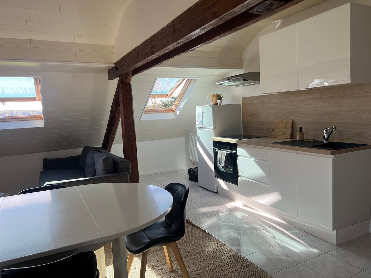 Bienvenido a la guarida del lobo, alojamiento 1 Apartamento de 50 m2 reformado en 2020, amueblado y equipado con todo lo necesario para que su estancia sea como en casa. Situado en un lugar tranquilo y apacible. El acceso es independiente con una terraza y aparcamiento privado (el aparcamiento tiene videovigilancia) Cocina totalmente equipada Sala de estar: sofá cama 140/200, TV naranja y Netflix incluido Dormitorio 1 cama doble 180/190 Cuarto de baño equipado: secador de pelo, toallas, etc.