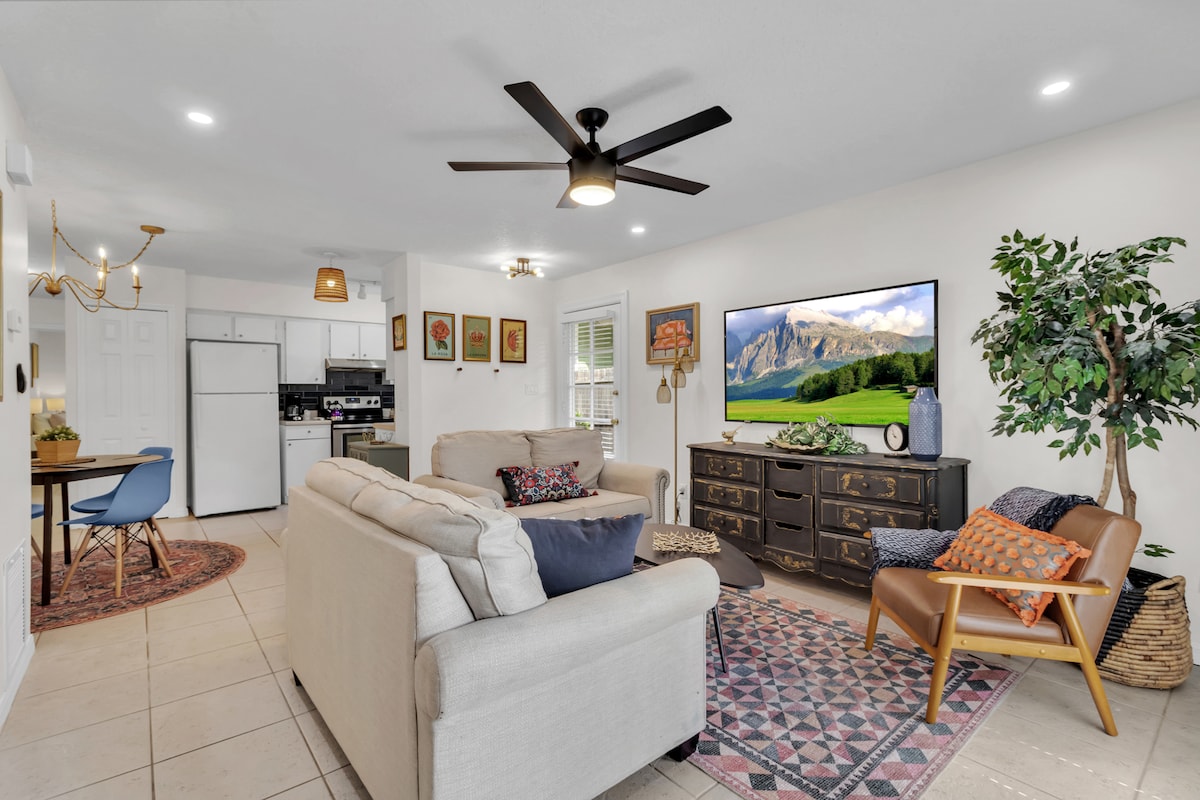 Lugar hermoso, moderno e inmaculadamente limpio con carácter y encanto de pueblo pequeño ubicado en el corazón del centro histórico de Sanford. ¡A solo unos pasos de los mejores restaurantes y entretenimiento, y a poca distancia en coche de todo lo que Orlando tiene para ofrecer! Te encantarán los dos amplios dormitorios, cada uno equipado con lujosas camas tamaño king y sus propias estaciones de trabajo. Las habitaciones están divididas en cada extremo de la casa para mayor privacidad. Prepara una comida o sírvete una bebida en la encantadora cocina totalmente equipada.