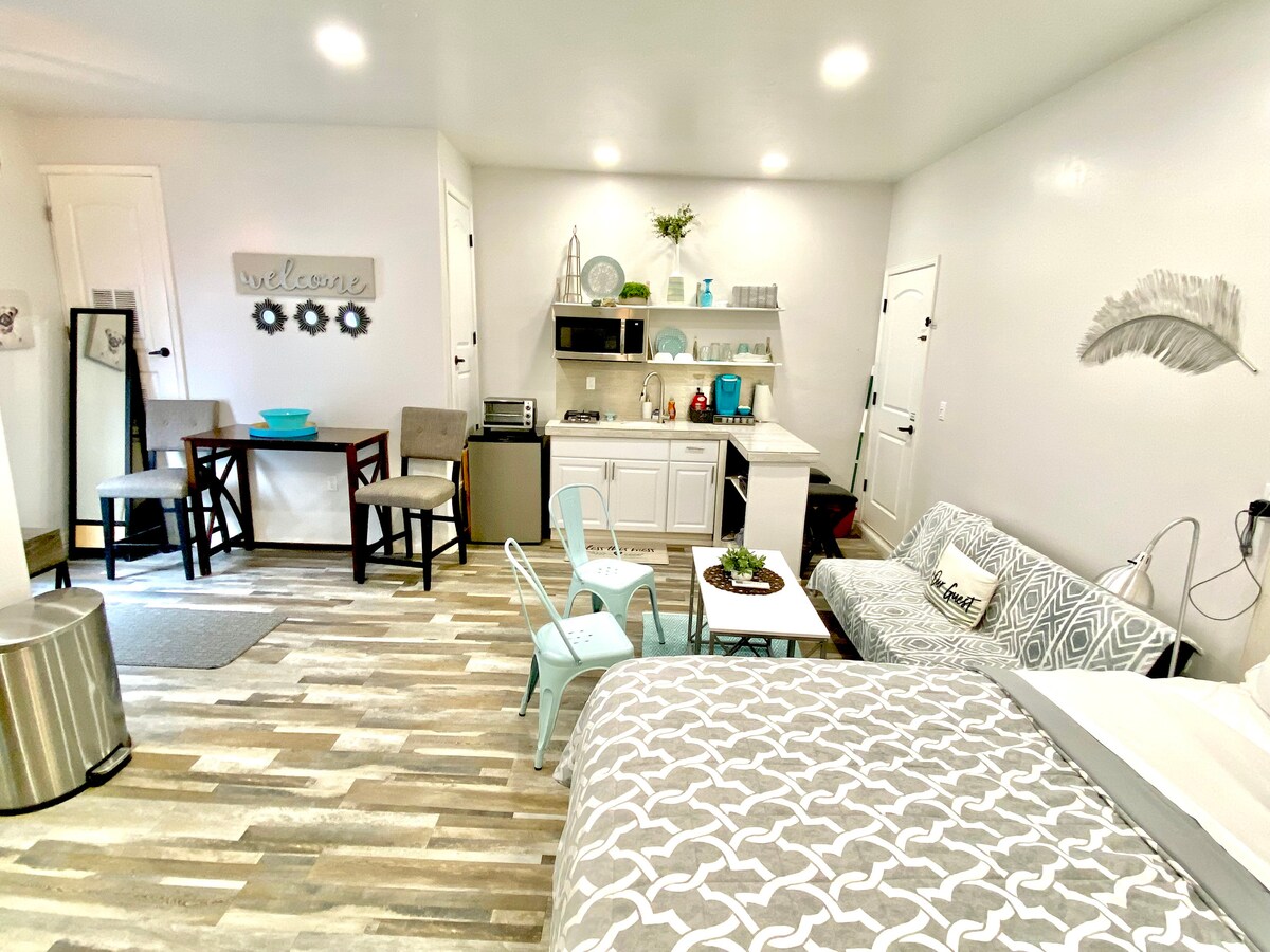 Relájate en este espacio tranquilo y elegante. Hermoso estudio nuevo, tiene una sala de estar con televisión y una bonita chimenea , un sofá cama, una cama completa, un armario , un amplio baño con ducha ,también se incluye una lavadora y una secadora en uno, cocina con todo lo que necesitas, platos, cafetera, tostadora, ollas y sartenes. También proporcionamos moisés para bebés y mucho más. Muy bonito vecindario tranquilo, las tiendas están a pocos minutos.