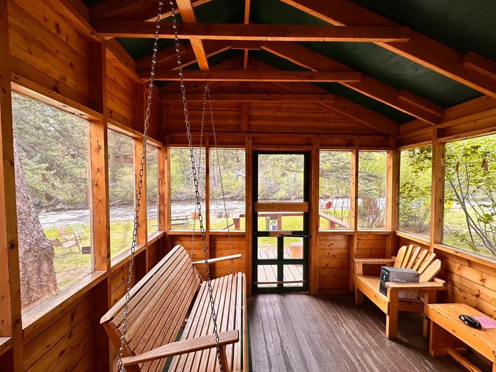 Nestled in the outskirts of Lyons, Colorado, just 11 miles from Rocky Mountain National Park (6 miles southeast of Allenspark), the Riverside Cabin combines the charm of a classic rustic log cabin with modern mid-century upgrades. You can admire the picturesque Colorado sunsets from the swing on the wrap-around deck, the hot tub, or through the floor-to-ceiling windows in the living room, which offer stunning views of the Saint Vrain Creek and wooded mountainside.