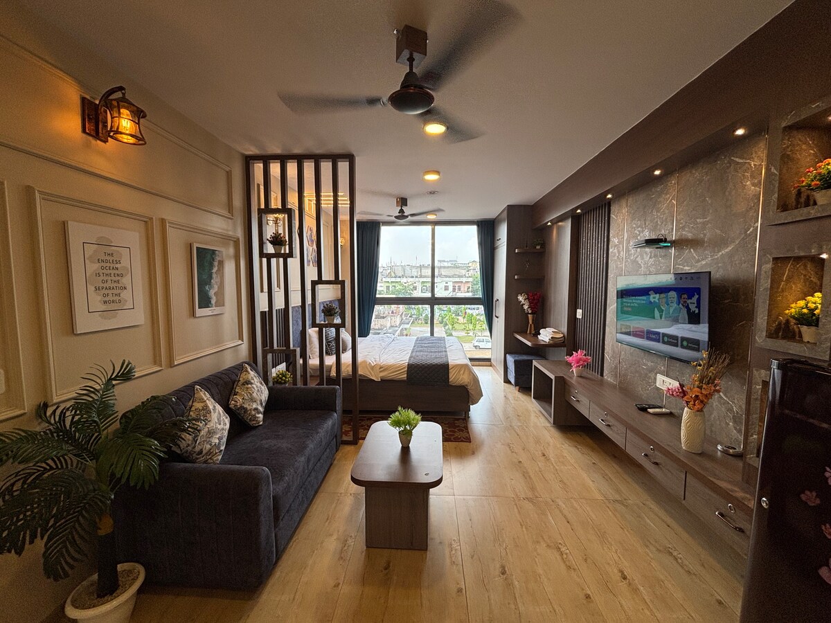 Bienvenidos a nuestro acogedor estudio en Jaipur: una estancia elegante y compacta en una de las zonas más exclusivas y seguras de la ciudad.Nuestro lugar está perfectamente ubicado a pocos minutos del World Trade Park (WTP), el aeropuerto de Jaipur y la icónica puerta Patrika. El estudio está diseñado con esmero, con una distribución abierta y luminosa, una cama cómoda y una práctica cocina americana para preparar té o café. Ya sea que estés aquí para explorar Jaipur, asistir a reuniones, comprar alrededor de WTP o tomar un vuelo rápido, este espacio hace que tu estancia sea sin esfuerzo.