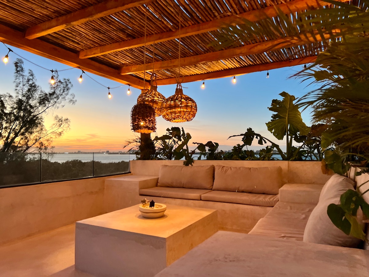 🌴360 Penthouse cuenta con un patio privado en la azotea con jacuzzi y tumbonas. Este es el apartamento que todos los demás huéspedes van a envidiar. Nuestro edificio, TAKH, se encuentra en la zona hotelera. Disfruta de nuestra vista de 360 grados en la azotea con vistas al fresco mar Caribe y la laguna de Nichupté. Características especiales: 💦Gran piscina en la azotea con baños y duchas al aire libre. ✈Aproximadamente a 15 minutos del aeropuerto de Cancún. 🏖Cruzando la calle de la playa. 👔Lavandería 🚗Garaje Este es el lugar ideal para estar en Cancún.