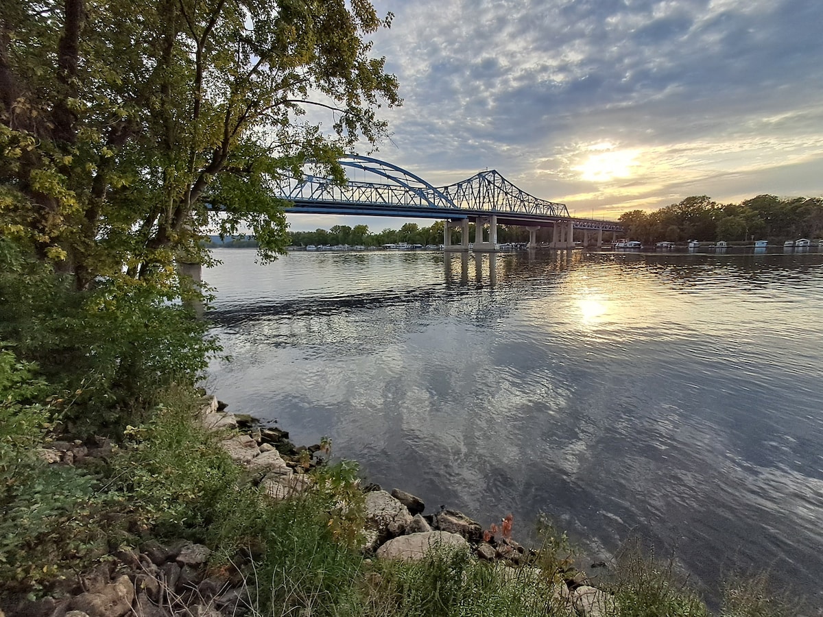 Estamos en el poderoso río Misisipi. Tu patio trasero. Puedes sentarte en tu porche, terraza a la sombra, terraza para tomar el sol o caminar hasta el muelle y disfrutar de tu café de la mañana. Por la noche, puedes sentarte en el muelle y ver una hermosa puesta de sol. Las águilas son visitantes de la zona, así como las garzas azules, las nutrias de río, los ratas almizcleras y variedades de patos. Este es realmente un lugar para aquellos a los que les encanta estar en el agua. Cuando termine el día, entra en tu hogar lejos de casa (gastos de limpieza incluidos).
