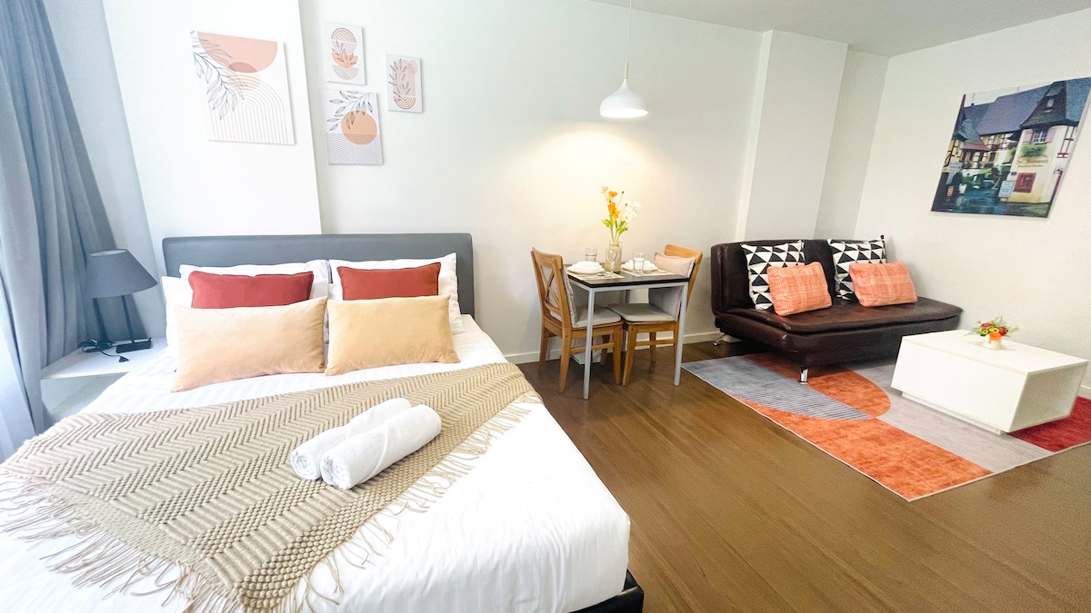 Elegante estudio de 30 metros cuadrados con vistas a la ciudad y a la montaña. Limpieza gratuita durante tu estancia (limpieza diaria atendida por tarifa diaria y dos veces por semana para el contrato de tarifa mensual). Cocina totalmente amueblada y equipada. Wifi gratis. A unos 10 minutos a pie de la playa Hua Hin. Se encuentra justo al lado del centro comercial Hua Hin Market Village, el centro comercial más popular.