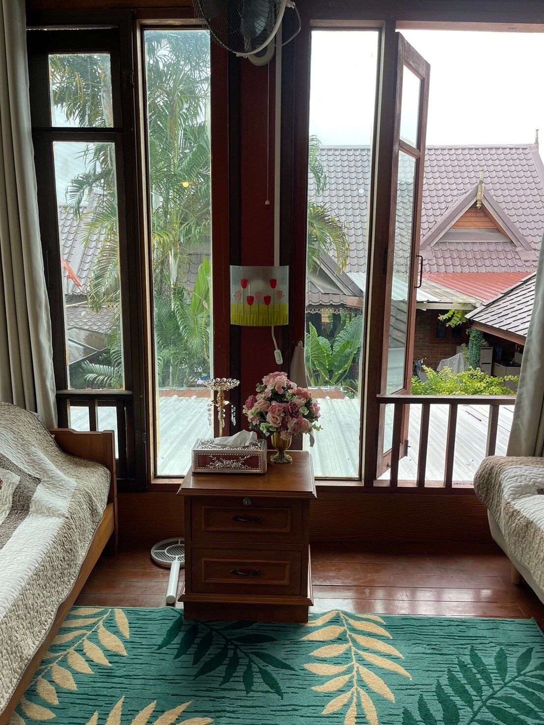 Hi Everyone! Please see my profile for other beautiful houses I have listed in Chiang Mai! This is a unique hand-crafted teak house nestled on the foothills of Doi Suthep Mountain. It is in a very green, verdant area, a neighborhood filled with cafes, restaurants, temples, and the popular Ban Khang Wat artist boutique and market. The house is three stories tall, and has three bedrooms, each with its own bathroom. It has a full kitchen and living room, fast internet, and off-street parking.