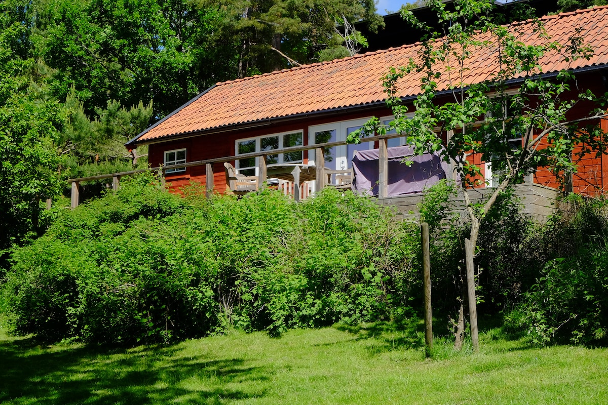 Encantadora casa de campo de 130 años (90 m²) con un ambiente moderno pero acogedor. Dos spas de renombre (Yasuragi y Skepparholmen) a pocos pasos. Planta baja: cocina y comedor con estufa de leña clásica, sala de estar y baño. Tu propio jardín y espaciosa terraza de madera, perfecta para tomar el sol o barbacoas. Ubicado en una hermosa zona con un lago cristalino para bañarse a solo 200 m de distancia, con una reserva natural que lo rodea. Muelle marítimo ~700 m. A 30 minutos de Estocolmo en barco, autobús o automóvil Waxholm.