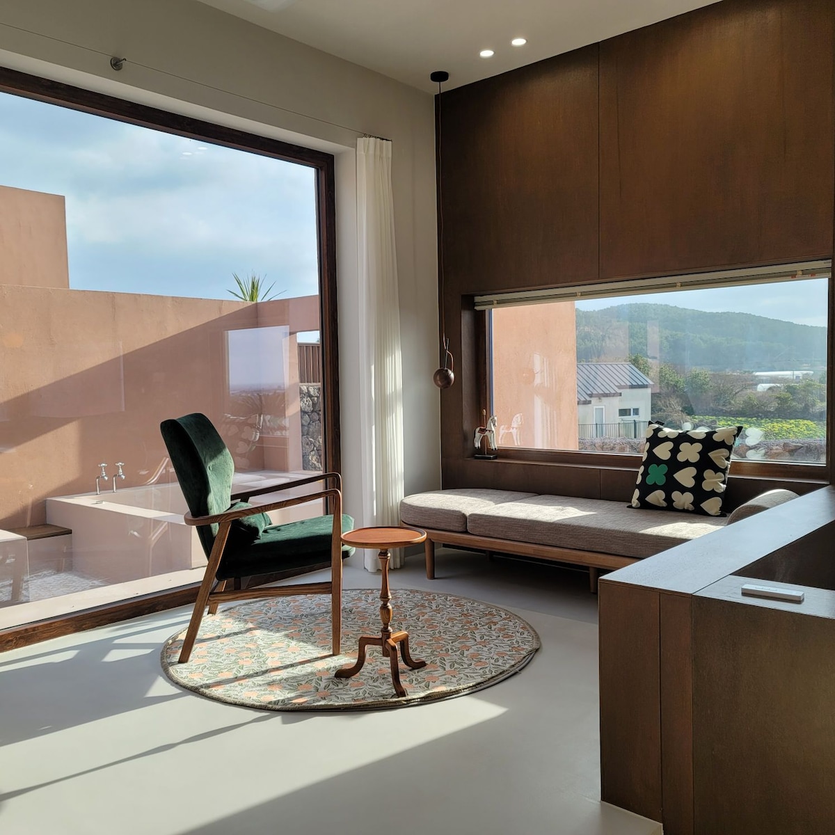 Arena y leche: se recomienda arena para estas personas. Parejas, familias, grupos pequeños que buscan un alojamiento privado y unifamiliar Aquellos que quieren relajarse tranquilamente mientras disfrutan del jacuzzi y la chimenea Personas que valoran los espacios emocionales y los interiores Aquellos que quieren un alojamiento cómodo con compañía y movimiento Instrucciones para🛋 el espacio Sala de estar y cocina / 2 dormitorios Baños individuales para cada dormitorio. → Es una estructura donde puedes alojarte cómodamente con compañeros. Techos altos, muebles altos y accesorios de ultramar Este es un alojamiento privado con un ambiente cálido y exótico. El anfitrión lo construyó él mismo y se esforzó mucho en los detalles. ♨️ Jacuzzi y 🔥 fogata Jacuzzi con vistas a la naturaleza Termina el día lentamente con una cita para cenar. ☕ Hora del brunch y café Para que puedas disfrutar de un brunch sencillo Hemos preparado ingredientes para el desayuno y utensilios de cocina. 🎬 Comodidades prémium Lavavajillas / lavadora / secadora, etc. Puedes quedarte cómodamente incluso si solo vienes. Este es un alojamiento registrado oficialmente como el n.º 1298 en Aewol, Jeju.