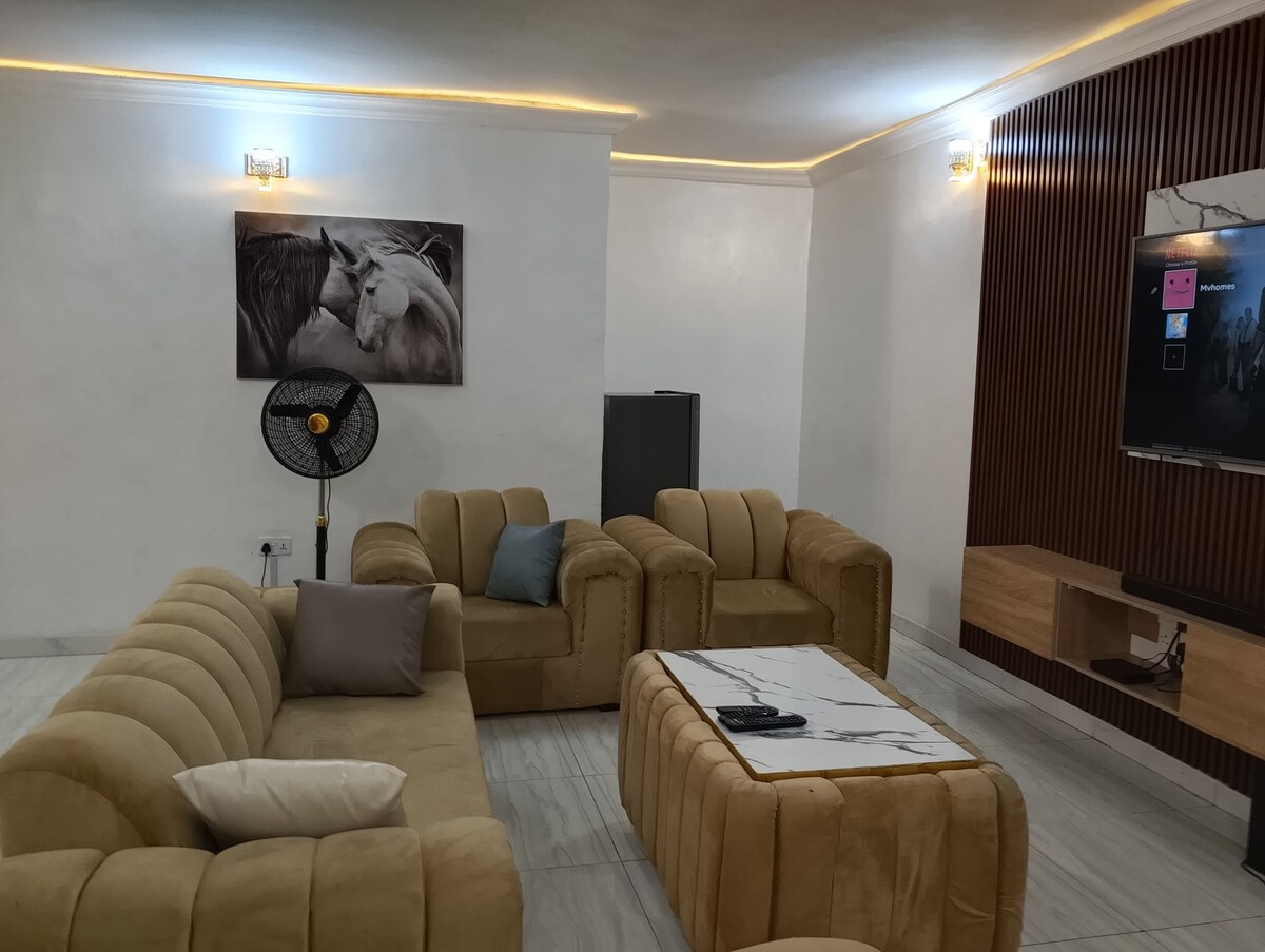 Experimenta la vida de lujo en este impresionante apartamento de 1 dormitorio, que combina perfectamente la comodidad y el estilo. Disfruta: Electricidad las 24 horas, 7 días a la Seguridad las 24 horas Ambiente acogedor Lujoso espacio de entretenimiento Servicio excepcional del personal dedicado Idealmente ubicado en un mini-estato seguro (carretera de mando de ajasa, abule-egba,lagos ) a solo 25 minutos del aeropuerto. ¡Haz de este apartamento la casa de tus sueños! Debido al estado de la red eléctrica, el uso del aire acondicionado se limitará cuando se utilice el generador para priorizar un suministro de energía más prolongado a través del inversor.