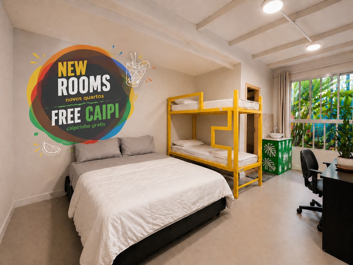 A suíte completa e privativa oferece porta trancada por chave, guarda-roupas, escrivaninha com 2 cadeiras, televisão, travesseiros, roupa de cama, toalhas, cobertas estilo "manta" e edredons higienizados e de qualidade. Acomoda até 3 hóspedes com 1 cama king e 1 cama de solteiro premium disponíveis. Informações importantes: - Não servimos café da manhã; - Não realizamos limpeza diária do quarto durante a estadia.