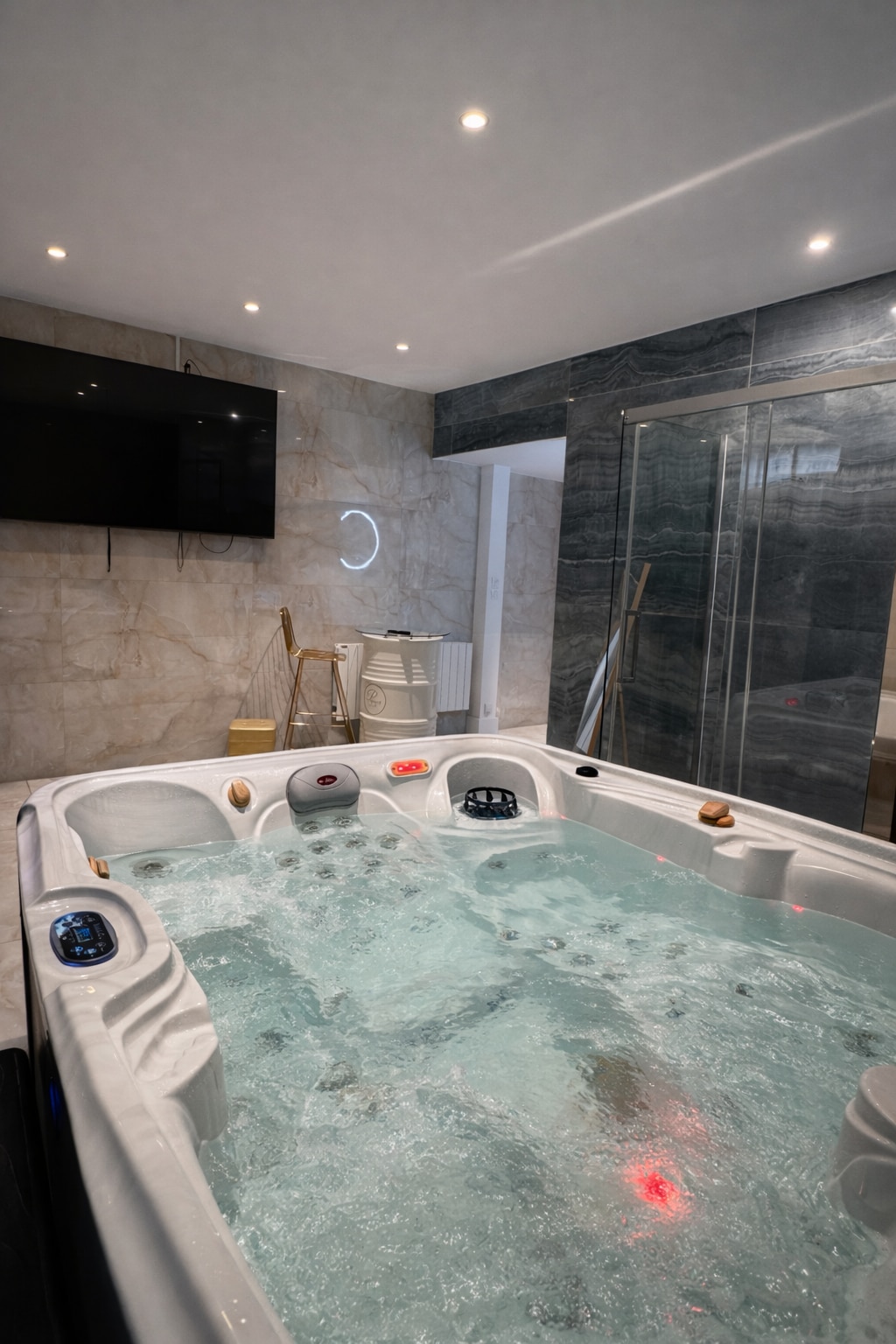 Bienvenido a La Perle Blanche, un verdadero nido de relajación y serenidad. Disfrute de un jacuzzi privado y una gran ducha para un momento de relajación absoluta. La cama espaciosa, con un segundo televisor enfrente, le promete noches acogedoras. Una modesta zona de cocina con nevera, microondas, vajilla y cafetera está a su disposición para mayor comodidad. Todo está reunido para una escapada romántica inolvidable. Reserva ahora y déjate seducir.