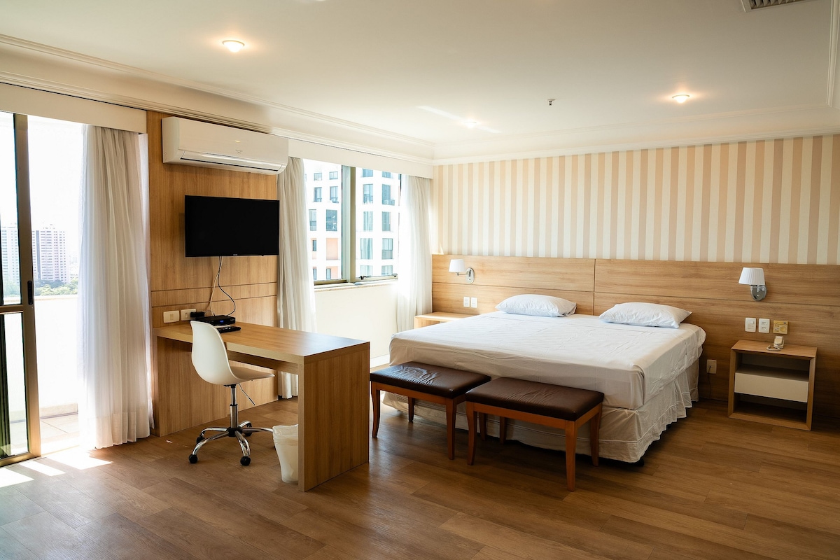 Excelente piso, 01 dormitorio/suite con mini cocina. Ambiente limpio y acogedor en la mejor ubicación de Barra da Tijuca. Vista verde y piscina, entorno tranquilo con wifi, Claro Net TV, Nespresso, 01 cama doble queen, 01 cama individual y aire acondicionado Split. Piso que contiene restaurante, cafetería, piscina, cancha multideportiva, centro de convenciones, salones, minimercado, lavandería, gimnasio, recepción y mantenimiento las 24 horas, ferry para acceso gratuito a la playa, en resumen, seguridad total.