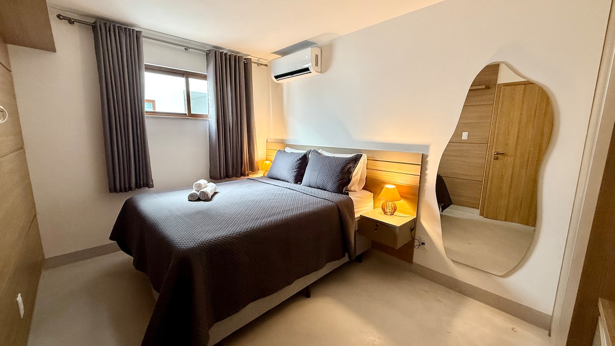 Apartamento recém construído, 100 m² de área privativa!! 50 m² entre sala-cozinha totalmente equipada com sofá-bicama e SmartTV 40¨com SKY; e suíte com cama king-size e SmartTV 4k 43''; e 50 m² de varanda com piscina particular e vista para mata atlântica. Todos os ambientes são espaçosos, climatizados e com Wi-Fi. Localizado no começo da 3°praia, a 2 min do mar, é o lugar certo pra curtir Morro; perto de supermercado, bares e restaurantes, mas em uma tranquila área residencial.