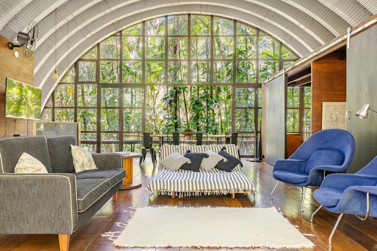 Bebe un vaso refrescante del agua de manantial natural, luego date un chapuzón en la piscina natural aislada de esta obra maestra arquitectónica inspirada en la naturaleza, en el corazón del bosque. Recoge plátanos, busca monos y observa cómo revolotean mariposas azules. Ubicada en el condominio ecológico Aldeia Rizoma (a 15-25 minutos del centro de Paraty), la casa es muy cómoda, completamente equipada y con conexión a internet por Starlink.