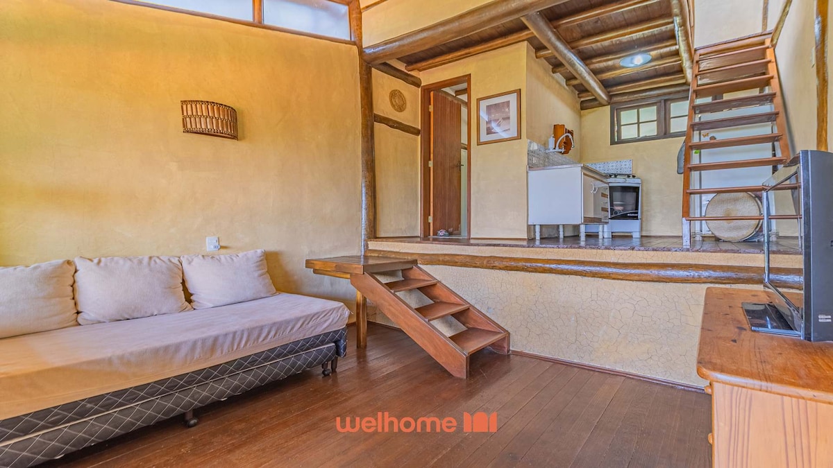 Encantador chalet de madera con 42 m², 2 dormitorios con aire acondicionado (calefacción y refrigeración) y televisor inteligente de 32 pulgadas, wifi de fibra de 1 Gb y 2 balcones, uno en la entrada y otro en el dormitorio principal. La sala de estar tiene una chimenea, un televisor inteligente de 50 pulgadas con Netflix y YouTube, un sofá retráctil y reclinable y 2 tragaluces donde puedes ver tucanes y loros. La cocina cuenta con lo esencial para preparar tus propias comidas.