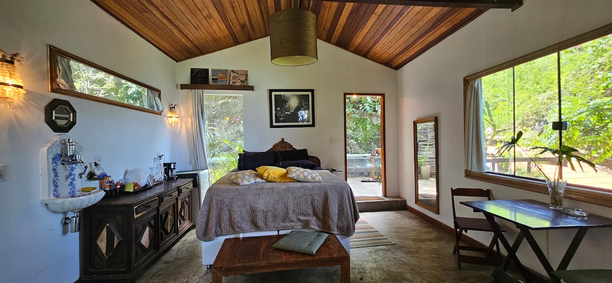 Una casa en el bosque, rodeada de naturaleza, con vistas al mar y al amanecer. Barrio seguro frente al Sheraton Hotel, a solo 5 minutos a pie de la playa. Cerca de Leblon, São Conrado e Ipanema. Este es uno de los alojamientos más singulares de Río: monos saltando a través de los árboles, tucanes visitando y por la noche te quedas dormido con el sonido del océano. Entrada privada• Terraza exclusiva en la azotea• Baño privado• Aire acondicionado• Cama tamaño queen• Mininevera en la habitación• Estacionamiento• Café gratuito