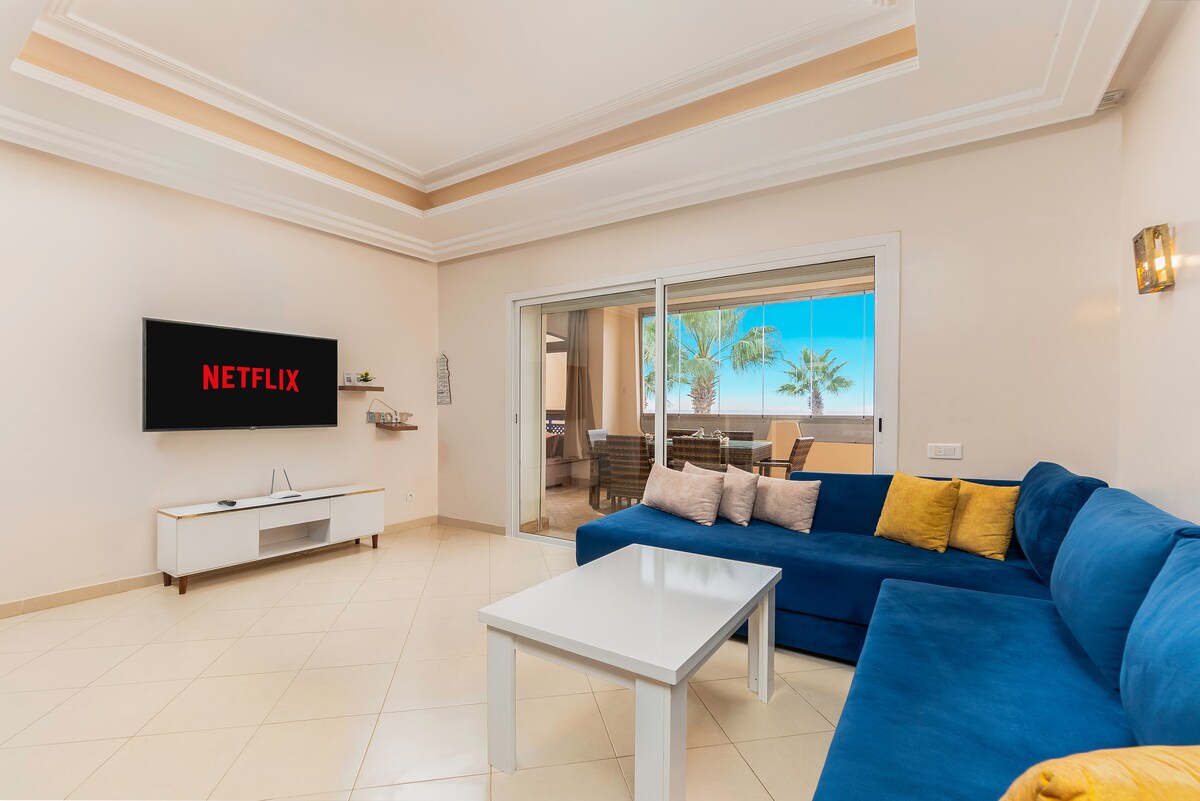 Cet appartement lumineux allie design épuré et confort haut de gamme, avec une vue sur la piscine depuis sa terrasse. Le jacuzzi privé vous offre des moments de détente inoubliables, entre bains chauds sous le soleil et soirées étoilées. Idéal pour les couples, les amis ou les voyageurs en quête de surf ou Yoga, farniente et luxe. À proximité des spots de surf et des cafés branchés, vivez une expérience 100% Taghazout : paysages magnifiques, calme absolu et couchers de soleil magiques.