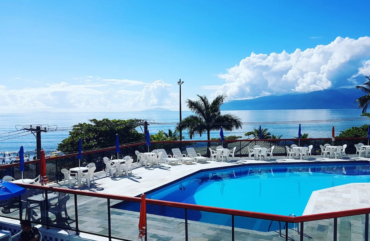 Condominio con acceso directo a la arena de la playa, piscina infinita climatizada con bar. Playa con más encanto de la región. Vista desde el apartamento al mar, piscina, playa, y Ilhabela. 01 plaza de aparcamiento. Como servicio básico se ofrecen a los huéspedes toallas y ropa de cama (almohadas y sábanas).