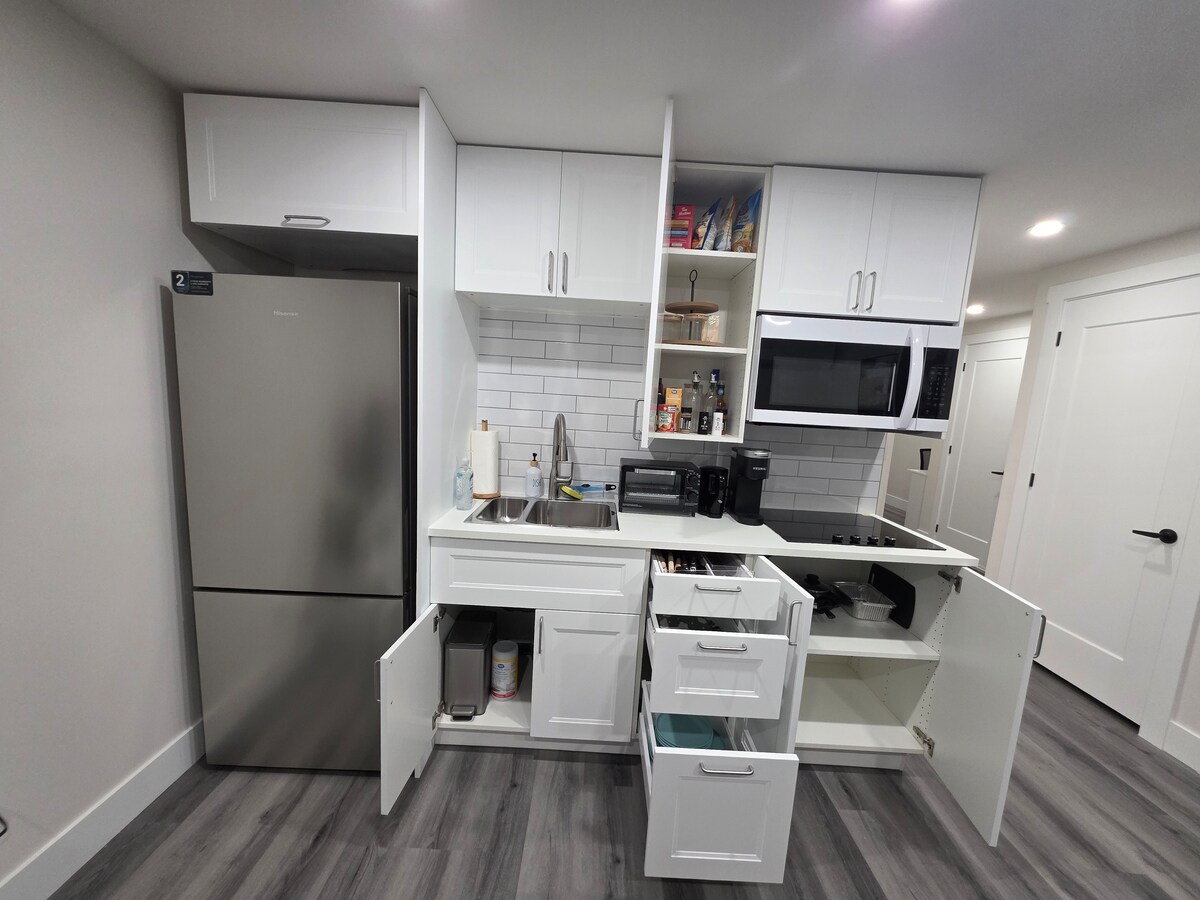 Bienvenido a nuestra nueva suite en el sótano de Airbnb, ubicada en el centro de Moncton, fácilmente accesible a lugares importantes. Disfruta de una estancia tranquila en nuestro apartamento de un dormitorio, tiene una entrada privada con cerradura digital, cocina pequeña (equipada con cafetera, hervidor eléctrico, cocina, microondas, freidora de aire/horno tostador, elementos básicos de cocina) una acogedora sala de estar completa con un televisor inteligente y sofá cama, una cómoda área de dormitorio, baño de 4 piezas y equipado con la comodidad de una lavandería en la unidad.