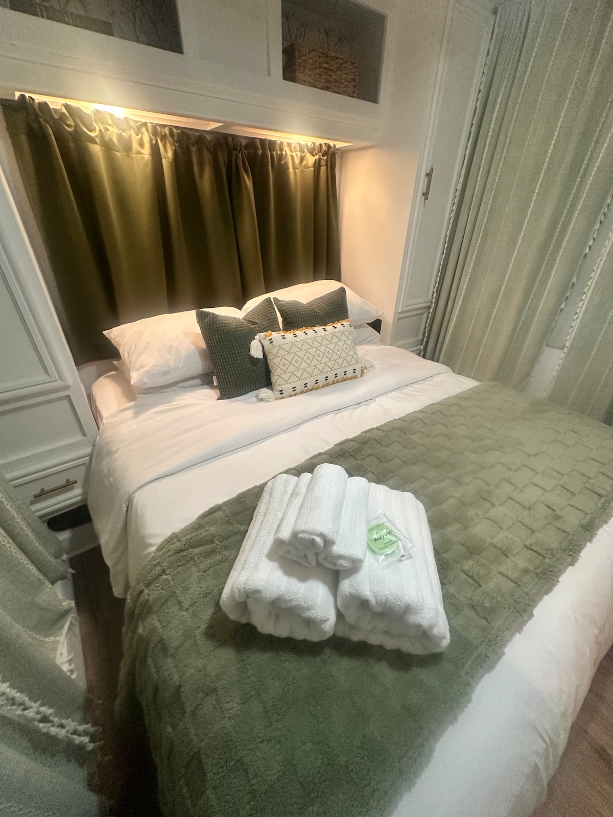 Vuelve a conectar con la naturaleza y disfruta de una estancia única en este Ford TravelMaster de 33' de 1992, renovado con un moderno diseño boho con la comodidad de una cocina interior, fregadero completo, mininevera, baño y ducha, aire acondicionado y calefacción en el techo, RokuTV inteligente de 24” y tocadiscos. Nuestra acogedora autocaravana tiene capacidad para un máximo de 4 personas. Encontrarás una cama tamaño queen en el dormitorio principal y 2 áreas para dormir adicionales. Por favor, avísanos con antelación si prefieres que el comedor se convierta en una zona para dormir.