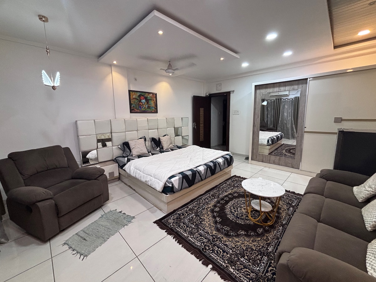 Olvídate de tus preocupaciones en este espacioso y sereno alojamiento de 3000 pies cuadrados, tiene un ambiente luminoso y moderno, con suelos de baldosas pulidas y paredes blancas en todas partes. Una sala de estar con un sofá marrón oscuro, un comedor con una mesa y sillas, y una cocina con gabinetes blancos y oscuros. Las habitaciones tienen armarios grandes, y también hay un balcón con vistas a los alrededores. NOTA: POR FAVOR, EVITA EL RUIDO FUERTE/LA MÚSICA/EL BAILE/LAS FIESTAS, ya que este piso es parte de la sociedad y, por favor, sigue estrictamente las reglas de la sociedad.