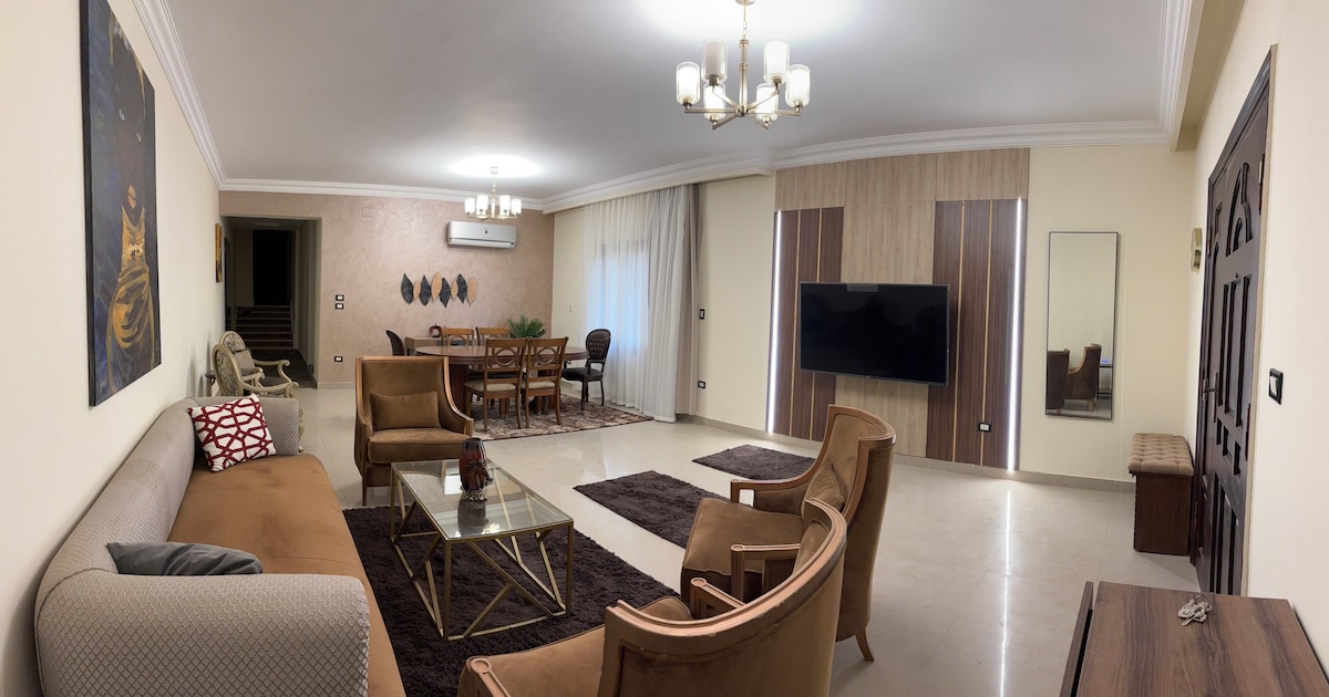 Escapa del bullicio de la ciudad y relájate en este tranquilo estudio de planta abierta de 90 metros cuadrados. Disfruta de una amplia sala de estar, una cómoda cama tamaño king y una cocina totalmente equipada inigualable. Ubicación: a solo 5 minutos en coche de AUC, The Spot Mall y Point 90 Mall, a 25 minutos del aeropuerto de El Cairo. Envíame un mensaje para obtener más información o reserva tu estancia al instante. Puedo ayudarte a planificar tu viaje, recomendarte auténticos restaurantes egipcios o guiarte a las joyas ocultas de la ciudad.