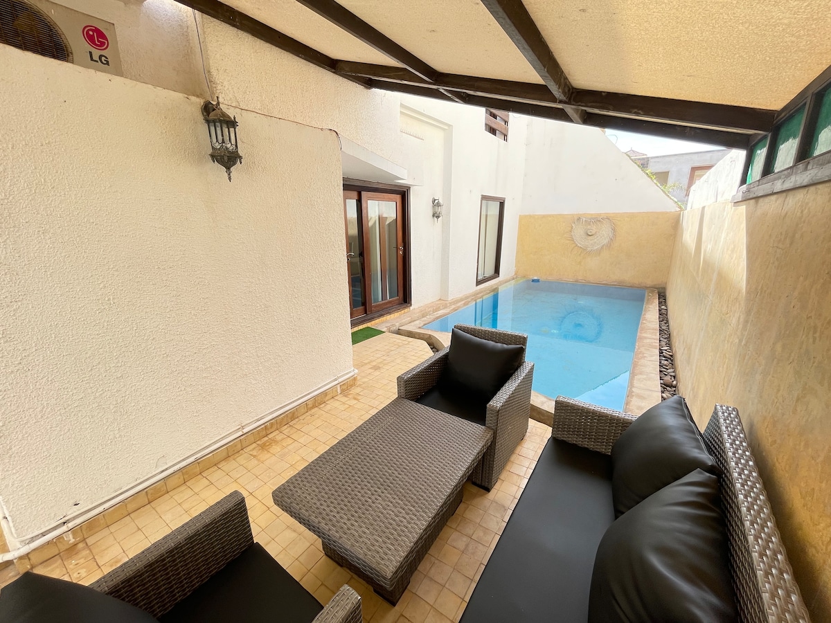 Villa con piscina privada climatizada (28 grados) en una nueva Residencia de lujo y segura las 24 horas para Max. 5pax (incluidos niños), golfistas, turistas, familias y explotada con servicios hoteleros incluidos un PDJ Continental, limpieza cada 3 días, servicio de conserjería 7/7; cocina privada posible y condiciones especiales en los campos de golf de Agadir, así como en el Golf Training Center. Está cerca de 3 minutos de 3 campos de golf y a 5 minutos del mar y del centro de Agadir.