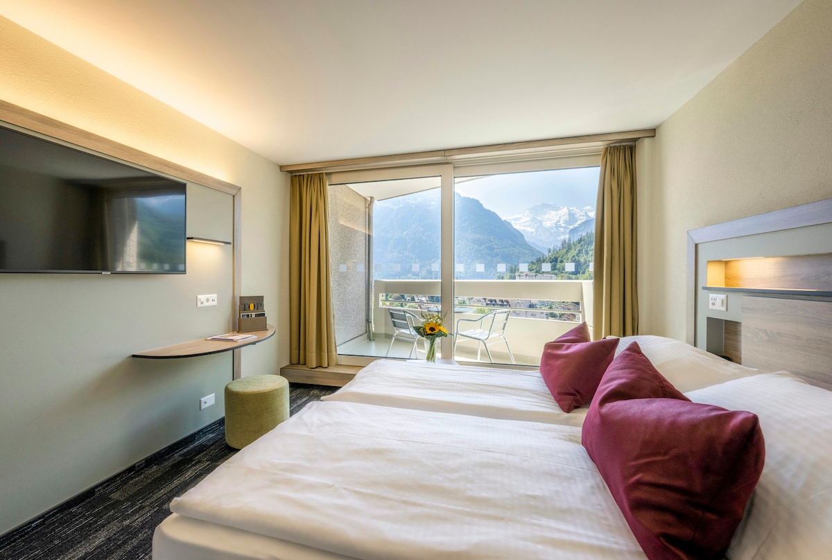 Moderna habitación doble de 19,4 m², tamaño queen Deluxe en los pisos 7–14 con una cama de 140x200 cm, balcón e impresionantes vistas a Jungfrau. Las características incluyen ducha, escritorio, TV, wifi, caja fuerte, minibar y mucho más. Prohibido fumar.