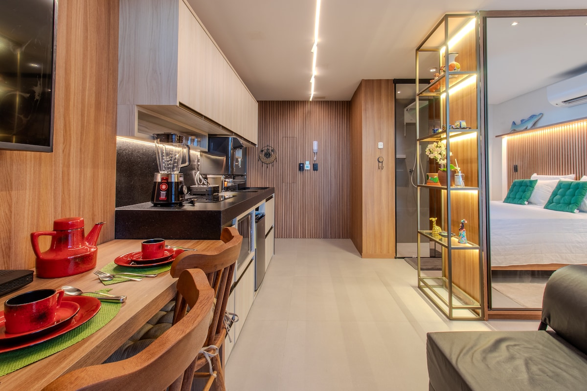 Bienvenido a su refugio junto al mar, en la deslumbrante Praia de Intermares, una experiencia que renueva el alma. Ambiente cálido, funcional y cuidadosamente decorado. Sala de estar aireada, integrada con cocina equipada, acogedora suite con aire acondicionado y baño reversible. Wi-Fi de alta velocidad. Piscina en la azotea con vista panorámica al mar. Garaje. Y, a pocos metros de bares, restaurantes, farmacias, lavandería y supermercados. Check-in fácil y flexible. Capacidad para 4 personas