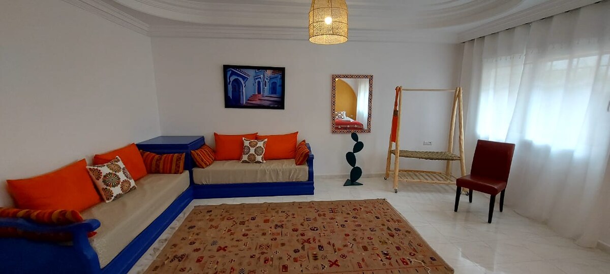 Este alojamiento tranquilo ofrece una estadía relajante para toda la familia, a menos de 20 Mint (14Km) del aeropuerto internacional de Agadir. el apartamento situado en un barrio bien tranquilo frente a una terraza cerrada no hay ruido de coche solo estacionamiento, estilo marroquí lejos del ruido de la carretera. 2 MINT de la parada de autobús y 5 mint al mercado de frutas y verduras cerca del Golf du Soleil y Park National, bosque para las personas que les gusta caminar o hacer deporte.