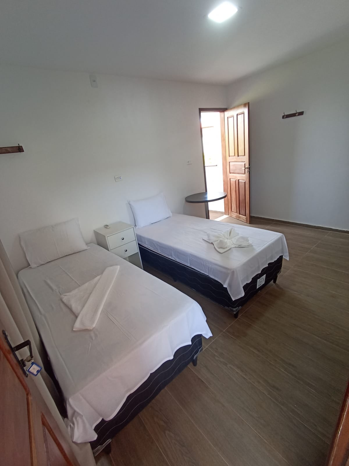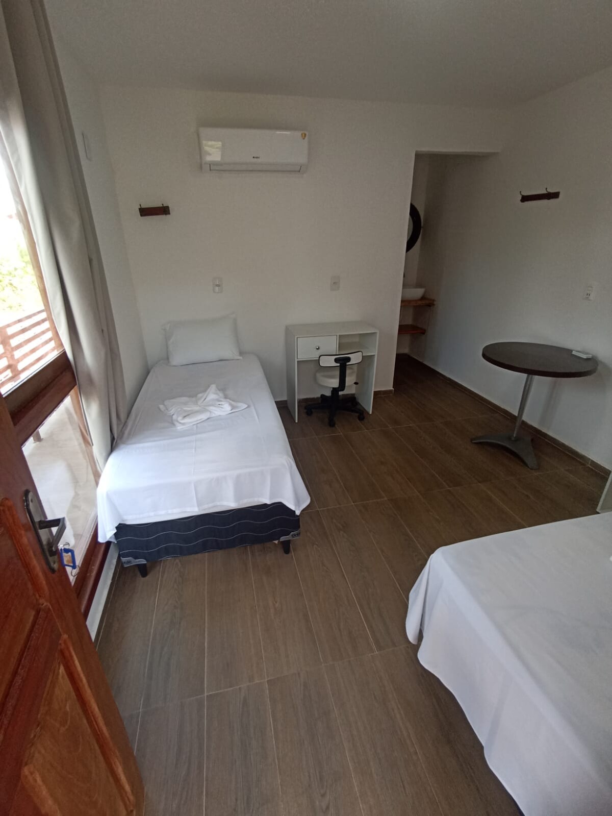 A acomodação oferece um ambiente confortável e acolhedor, com duas camas de solteiro, ar-condicionado e uma prática área de trabalho. O banheiro dispõe de chuveiro quente e box de vidro, enquanto o lavatório se destaca pela charmosa bancada de madeira e espelho criativo feito com aro de pneu. A varanda externa permite ótima ventilação e vista para o jardim, trazendo tranquilidade e uma experiência agradável aos hóspedes.