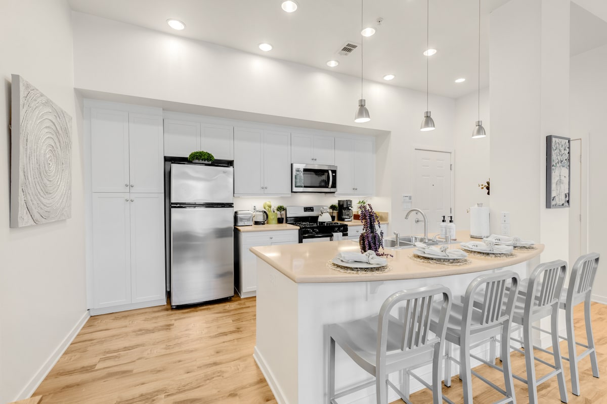 Disfruta de la vida en nuestro apartamento de gran altura, con impresionantes vistas al atardecer y al horizonte de la ciudad desde el balcón. Ideal para parejas, familias, trabajadores remotos y grupos. Ubicado en el corazón del condado de Orange, a pocos minutos del aeropuerto John Wayne, tiendas de alta gama y restaurantes. Nuestro santuario está inundado de luz natural y la cocina del chef cuenta con electrodomésticos de acero inoxidable de primera calidad. Eleva tu experiencia en el sur de California con estilo y comodidad. ¡Tu refugio de lujo te espera!