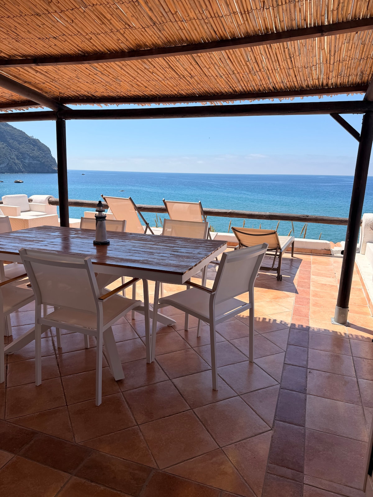 Maravilloso apartamento con una gran terraza en la hermosa playa de Cava dell'Isola, donde podrá disfrutar de sensacionales puestas de sol y cenar mientras se deja acariciar por el canto del mar. Bien amueblado y confortable, se distribuye en 2 niveles y cuenta con 3 baños, 3 dormitorios con vistas al mar y una gran sala de estar con una cocina contigua con vistas al mar. Encontrarás ropa de cama, set de baño, secador de pelo, toallas... A 5 minutos a pie del parque termal Giardini Poseidon y a 15 minutos a pie del centro de Forio. Camino privado a la playa.