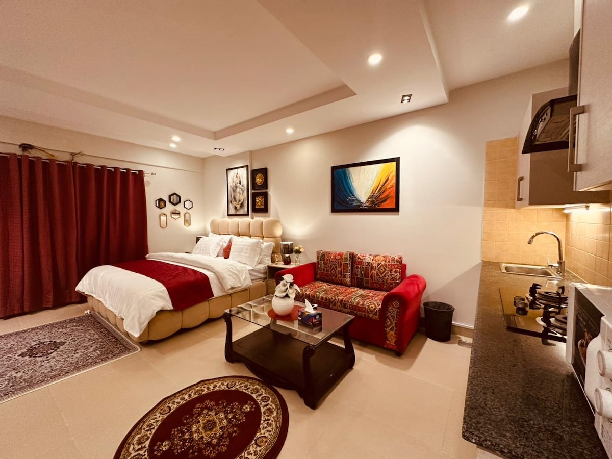 Condominio de diseñador 1BHK | Zeta Mall y vistas a la colina Cama ✨ tamaño king y balcón privado Televisor inteligente de📺 55 pulgadas y WiFi ultrarrápido 🍳 Cocina totalmente equipada ❄️ Aire acondicionado con inversor y agua caliente Cerraduras 🔒 inteligentes y decoración moderna 🏙️ Sobre el patio de comidas del centro comercial Zeta, a pasos del centro comercial Giga Vistas 🌄 panorámicas a la colina Perfecto para familias y viajeros de negocios. Se requiere CNIC (mayores de 18 años). No se permite fumar/fiestas. ¡Reserva ahora para disfrutar de comodidad y estilo!