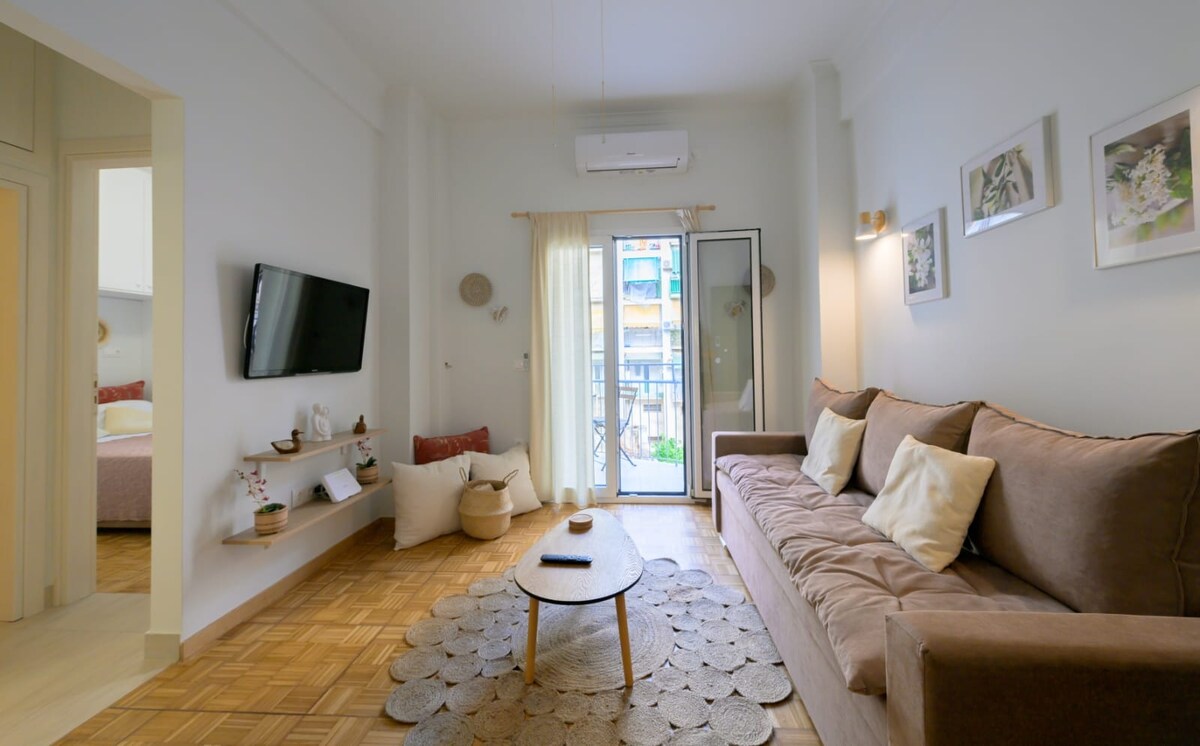 Disfruta de una escapada tranquila en el corazón de Chania en nuestro apartamento moderno recién renovado, perfecto para parejas o viajeros solitarios. Relájate en el espacioso jardín trasero compartido con césped sintético, donde puedes disfrutar de noches de cine con nuestro proyector Full HD (disponible bajo petición). Con wifi rápido y estable de 100 Mbps y proximidad a la playa de Koum Kapi, puedes disfrutar de una estancia tranquila y cómoda. Reserva ahora y descubre lo mejor del encanto y la hospitalidad de La Canea.