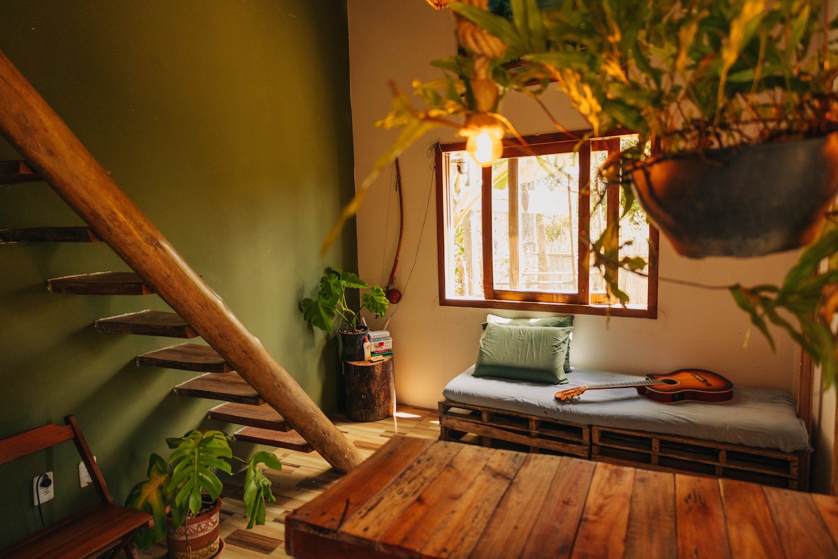 Hermosa casa con influencia arquitectónica de Polinesia, Bali y el encanto de Bahía. Privacidad total. Situada en un sitio de 3.000 m², tiene 120 m², 2 pisos, muchos balcones y jardín. Rústica, mixta de madera y mucho vidrio. Iluminación natural, aireado, silencioso, sin contacto visual con vecinos lejanos. Amplia y ventilada, se encuentra en la cima de la colina con impresionantes vistas al bosque. A pocos minutos del sendero a la playa de jeribucaçu. A 6 km de la ciudad. Ideal para Yoga, Surf y Meditación.