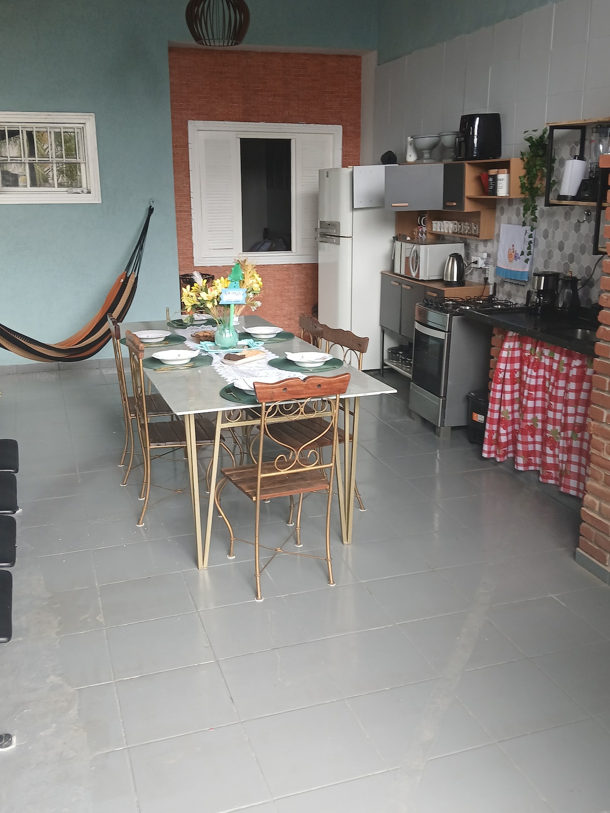 Casa con dos dormitorios dobles, uno con aire acondicionado y el otro con ventilador de techo, sala de estar y cocinas americanas con estufa, nevera, utensilios de cocina, con un baño interno y uno externo en la zona de barbacoa, garaje. Con fácil acceso a la autopista, y a 15 minutos de las playas Grande, Toninhas, Tenório, cerca de un supermercado, panadería, farmacia. NUESTRO PATIO TRASERO SOLO SE COMPARTE CON NOSOTROS, que vivimos en la casa principal, y el garaje está separado. No dejamos toallas y nos cubrimos.