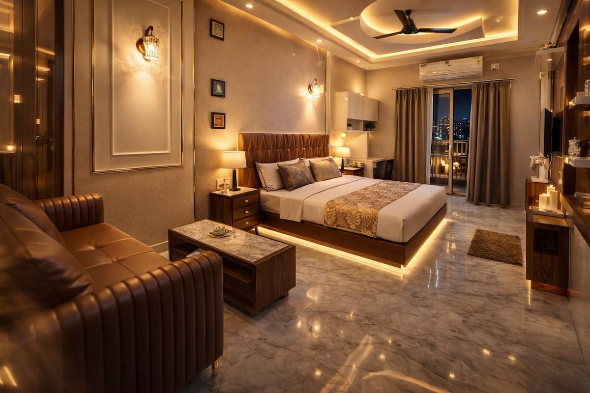 El primer apartamento de 2 Bhk que cumple con todos los requisitos ✨ - 2 dormitorios ( dormitorio principal, segundo dormitorio). - Dos camas tamaño king. - Una amplia sala de estar con una cómoda disposición de asientos. - 2 baños ( 1 en cada uno de los dormitorios). - Cocina pequeña (con todos los utensilios básicos de cocina disponibles y servicios abastecidos, es el lugar perfecto para preparar tus comidas favoritas) - Una zona de balcón compartido que conecta con el apartamento, que puede ser el espacio perfecto para tus paseos nocturnos. ¡Reserva ahora!