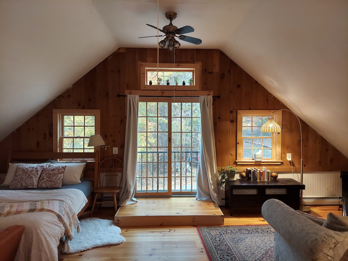 This spacious studio apartment is located in the former Swedish Congregational Church in historic Swedeville, a secluded hilly neighborhood built by Swedish immigrants in the 1800's. For years it housed Rick and Liza’s stained glass studio, which they have now lovingly and creatively transformed into a residence. The rental is minutes from the interstate and one mile from downtown Brattleboro, but the neighborhood has a rural and somewhat European flavor to it.