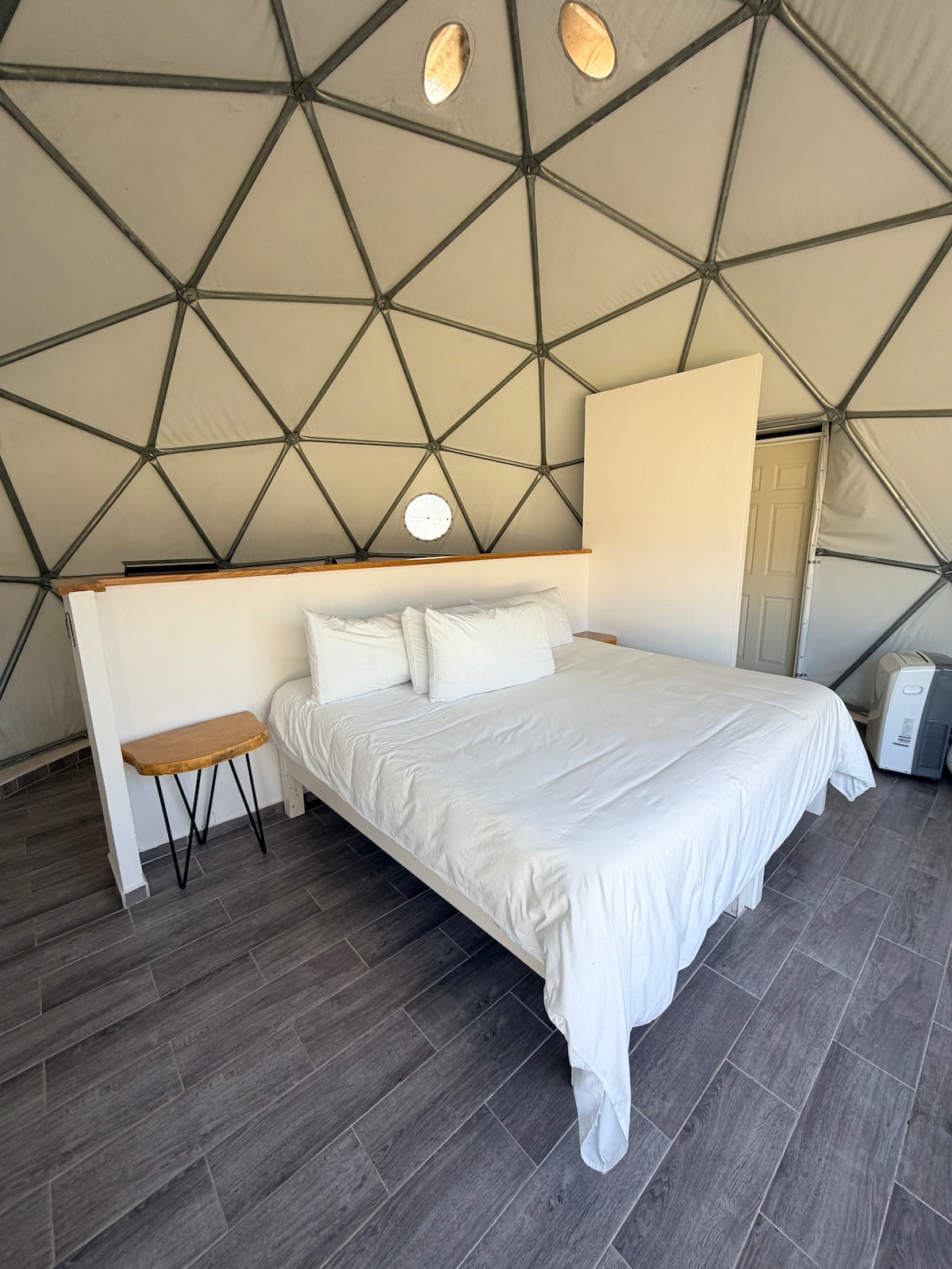 We have 3 more https://abnb.me/dobQuKhzUHb https://abnb.me/J2QI6zIzUHb https://abnb.me/4CukDRDzUHb This dome is a shell structure built from metal rods in this case, that allow the dome to withstand very heavy loads and high winds despite its lightweight structure. Most of the time when you think of glamping being off-grid comes with it. While you're not exactly off-grid here, as you do have electricity and wifi but you are off the beaten path enough to catch the sunset&sunrise from your dome.