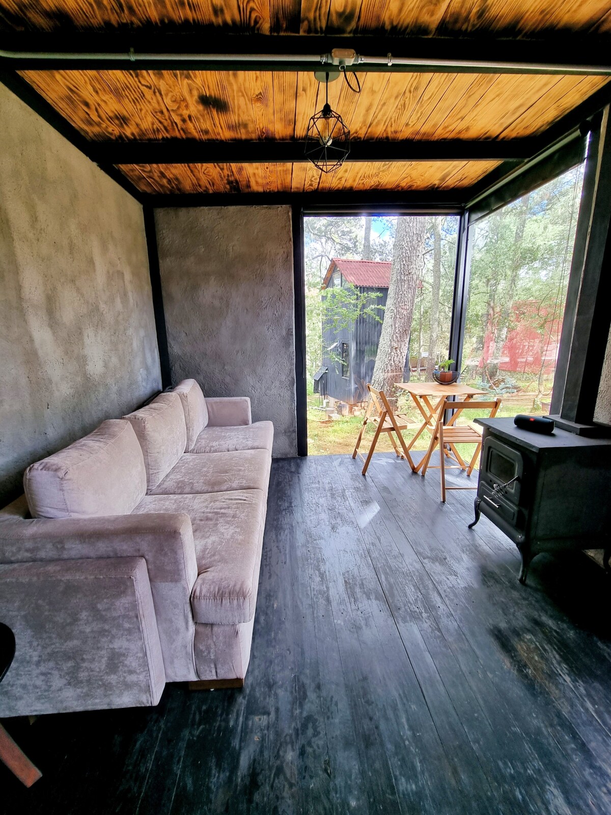 Vive la experiencia de alojarte en un espacio de diseño único. Nuestra Mini Cabaña tipo Contenedor combina la robustez del metal con la calidez de la madera para crear un refugio moderno y acogedor Disfruta de la luz natural que inunda el espacio gracias a sus amplios ventanales, desconéctate del mundo sin sacrificar ninguna comodidad. Es el equilibrio perfecto entre minimalismo inteligente y confort total. Un espacio pequeño en metros cuadrados, pero gigante en encanto y paz.