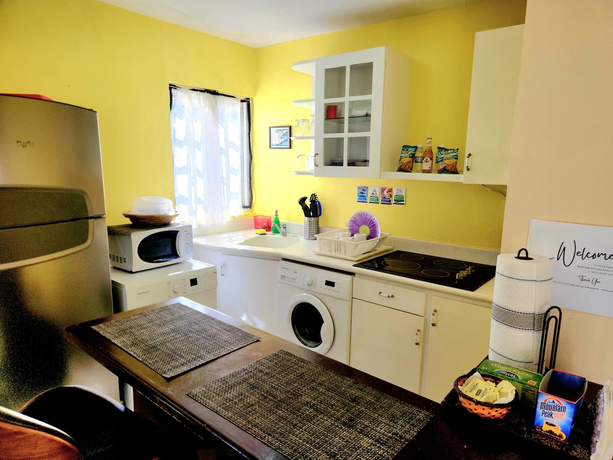 Relájate con toda la familia o amigos en este tranquilo alojamiento. Este alojamiento se encuentra en el segundo piso. Dormitorio 1 - Cama tamaño completo. - Vestidor de 6 cajones con espejo. - armario para pertenencias personales. - TV y stand - Baño privado con bañera. - Ventilador de cocina Habitación 2 -1 cama de matrimonio -1 cama individual. - Vestidor de 6 cajones - armario para pertenencias personales. - Televisión con soporte - Baño privado. - Ventilador de techo Balcón que conecta las habitaciones Cocina completa. - Refrigerador de tamaño completo. - Estufa de propano - Ventilador de techo