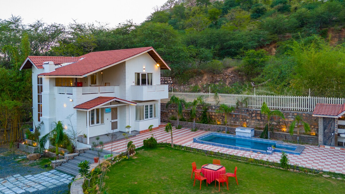 • <b> Villa de lujo Aravalli </b>: 15.000 pies cuadrados, 3BHK, admite mascotas, piscina privada y jacuzzi. • <b> De cortesía</b>: cesta de bienvenida y botella de vino tinto para celebrar el mes de San Valentín en febrero • <b> Cocina gourmet</b>: totalmente equipada con horno y chef (de guardia). Entrega de Zomato/Swiggy disponible. • <b> Entretenimiento</b>: césped de 4.000 pies cuadrados, mesa de billar, juegos interiores/exteriores, televisor inteligente de 75 pulgadas. • <b> Servicio completo</b>: conserje 24/7, chef disponible, estacionamiento para 5 autos.