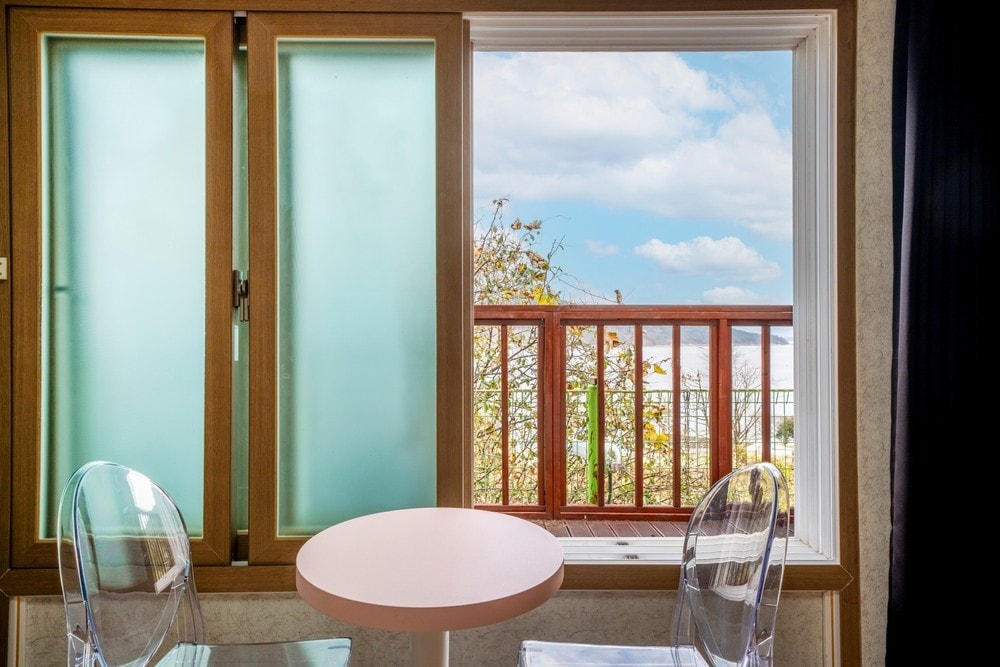 Gadeokdo, casa privada, habitación de ensueño en Green Pension. El mar visto desde el sofá de la sala de estar.