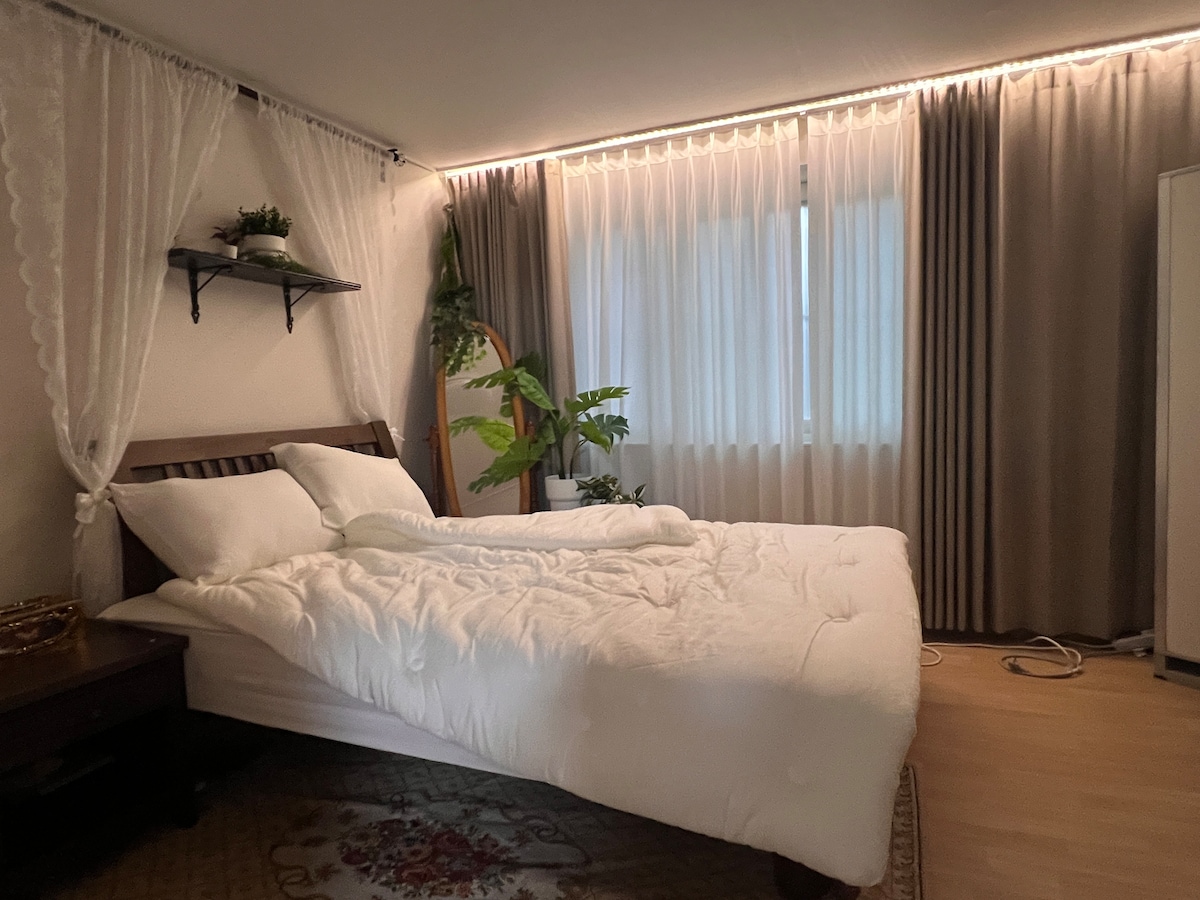 Es un espacio independiente y tranquilo ubicado en el segundo piso de un edificio de tres pisos con una entrada independiente. (Propiedad privada) Se puede cocinar de forma independiente, y los 2 dormitorios, la sala de estar y el baño están bien mantenidos. Ubicado a 1 minuto de Pun's Point Transporte conveniente (5-6 minutos a pie de la parada de autobús interurbano y de alta velocidad, 15 minutos en coche de la estación de Ulsan KTX, 3 minutos en coche de la entrada de la autopista, 20-30 minutos en coche del aeropuerto), y la parada de autobús de la ciudad está justo al lado de la puerta principal, y el acceso a los lugares turísticos circundantes es fácil. 15 minutos a pie de la puerta principal de la Universidad de Ulsan Paseo de 10 minutos a pie por Taehwa River Cheorseo Street (Jardín Nacional) Puedes visitar los principales lugares de interés turístico de Ulsan, como Oegosan Onggi Village, Whale Culture Village, Ulsan Bridge Observatory, Cheongyongam, Sinbulsan Eupseongwon, Mongdongjeongja Beach, Daewangam Park, Iksan Beach, Shinhwa Mural Village y Taehwa River Eupseongwon. Si viaja a Ulsan con su familia, amigos o por negocios, puede descansar cómodamente sin preocupaciones como en su propia casa. En primavera, venga a ver el camino de cerezos en flor y el palacio justo al lado de la casa... En otoño, venga a ver el Jardín Nacional del Río Taehwa~~