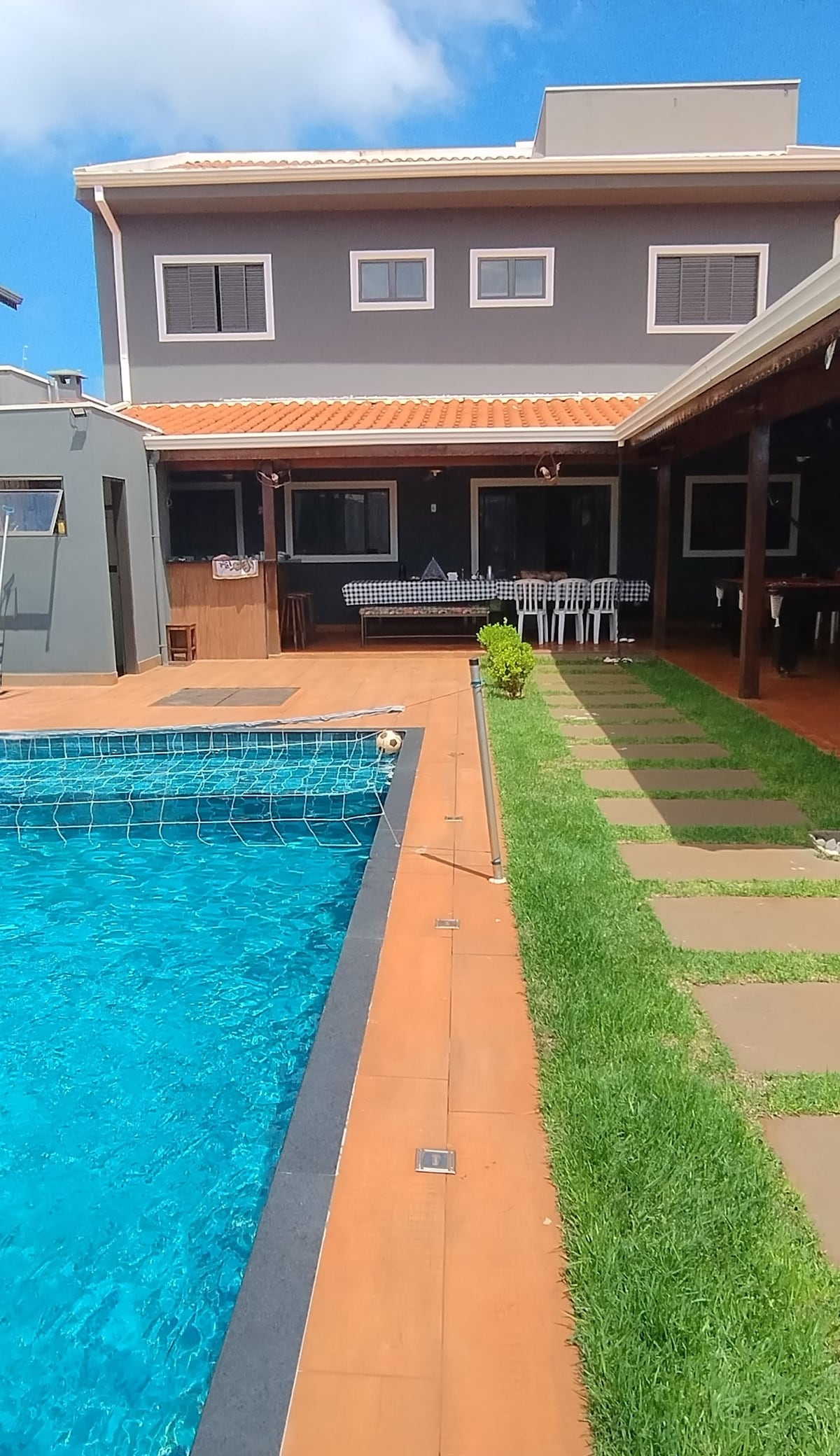 Zona de ocio familiar (Disponible para Agrishow) Espacio disponible para 50 personas. Espacio District Lazer con piscina, cocina, barbacoa, 3 baños, 1 dormitorio con 2 literas, 1 colchón doble de 1 tarjeta, 1 nevera, 1 estufa, 1 horno eléctrico, 6 juegos de mesa, entorno de sonido, mesa de billar, WIFI, 2 televisores, 1 proyector y garaje para dos coches. Otras notas No ofrecemos sábanas de cama y baño.