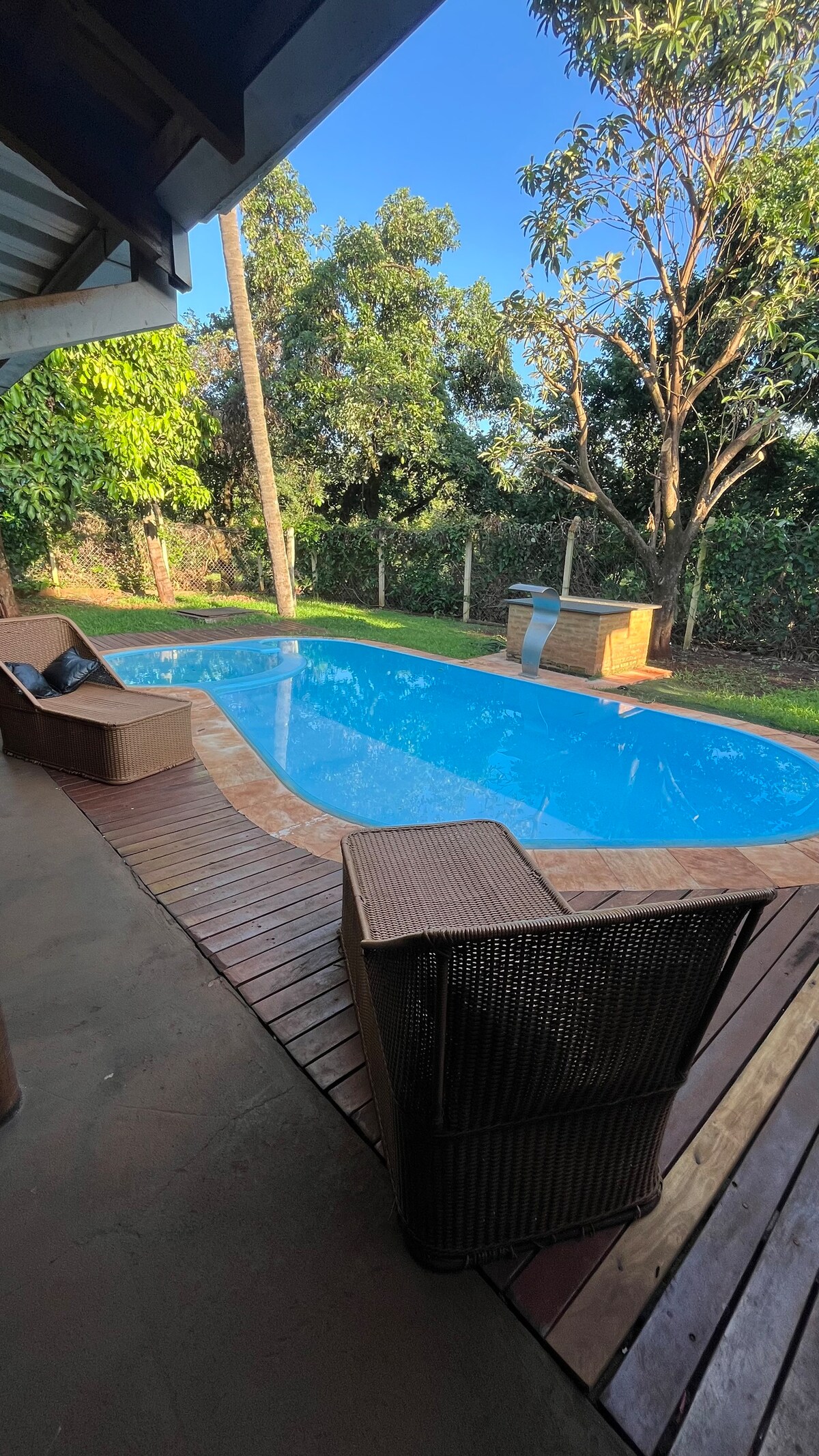Zona de ocio familiar (Disponible para Agrishow) Espacio disponible para 50 personas. Espacio District Lazer con piscina, cocina, barbacoa, 3 baños, 1 dormitorio con 2 literas, 1 colchón doble de 1 tarjeta, 1 nevera, 1 estufa, 1 horno eléctrico, 6 juegos de mesa, entorno de sonido, mesa de billar, WIFI, 2 televisores, 1 proyector y garaje para dos coches. Otras notas No ofrecemos sábanas de cama y baño.