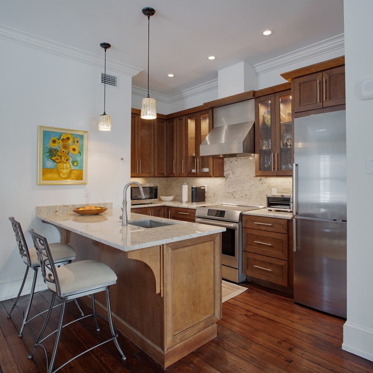 Decoración elegante, ubicación céntrica, a minutos del campo de golf, la playa, tiendas y restaurantes o quédate y cocina en una cocina completa. Ideal para viajes de negocios, con wifi abierto, televisión y lavadora y secadora completas.