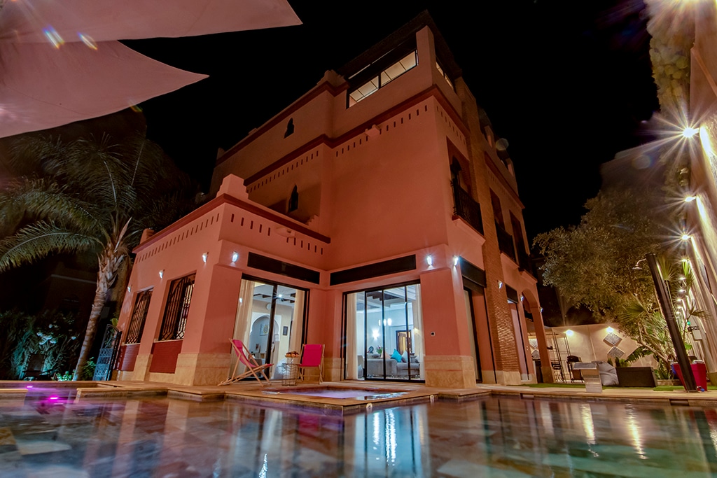 El Riad se encuentra en el barrio más bonito de Marrakech (Sidi Mimoun), cerca de la residencia del rey y del hotel «La Mamounia». La plaza «Jemma el Fnaa» y la «Koutoubia» están a pocos minutos a pie del riad. El riad consta en la planta baja de un salón/comedor con televisión y wifi; una cocina equipada (fogones, horno microondas, nevera/congelador...) y una piscina de 12 metros cuadrados L 4, l 3, H 1,4 todo abierto a las plantas superiores a las que se accede por una escalera de cristal. En la primera planta, dos dormitorios (uno con una cama grande de 160, el otro con dos camas de 90 que se pueden unir en una cama de 180) cada uno con un baño con una ventana que da a la primera terraza solárium. La escalera de cristal permite acceder a las dos terrazas (una solárium y la otra con una pérgola y un salón de verano) con vistas directas e impresionantes a los hermosos jardines del hotel «La Mamounia» sin ningún otro edificio enfrente. Un techo corredizo de cristal muy fácil de manejar permite aislar la parte habitable de la parte de las terrazas. Por otro lado, todas las zonas habitables (dormitorios y sala de estar) están equipadas con aire acondicionado reversible (frío y calor) para mantener una temperatura agradable en el riad en cualquier época del año.